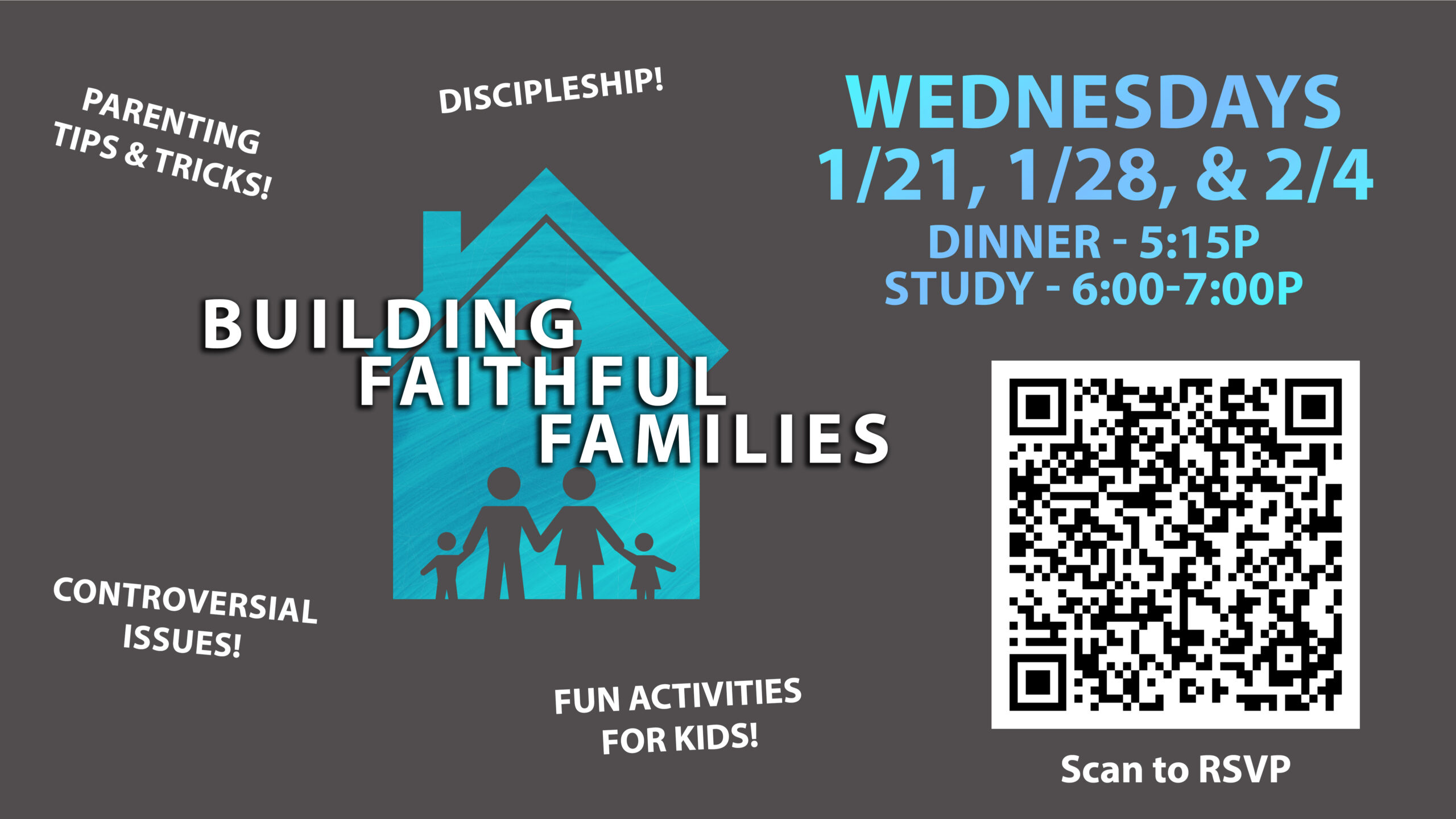 Join other parents on Wednesdays (1/21-2/4) as we grow together in our parenting and faith. Dinner is at 5:15pm with the study from 6:00-7:00pm.